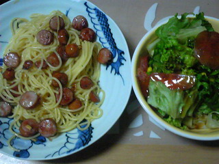 夜ごはんは、賞味期限間近のシャウエッセンでペペロンチーノ。