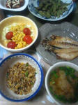 昨日の残りと、アジの開き、納豆炒飯、海老味噌汁。